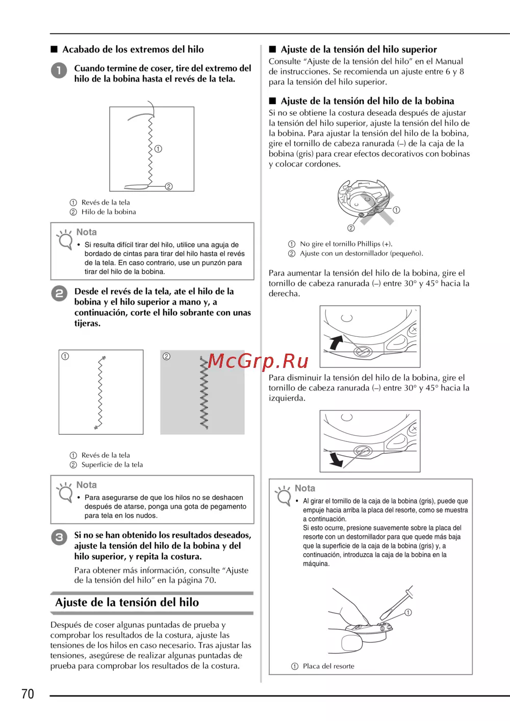 - Con unas tijeras corte con cuidado la punta del hilo lo más cerca posible de la bobina p.67