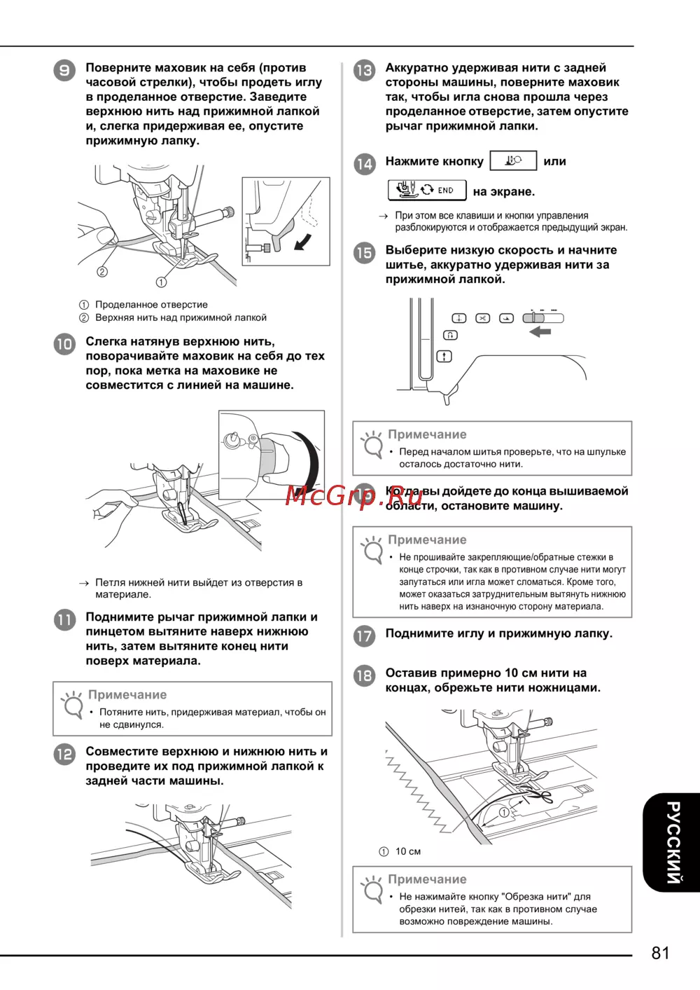 - Не тяните нить слишком сильно так как в противном случае возможно повреждение машины p.85