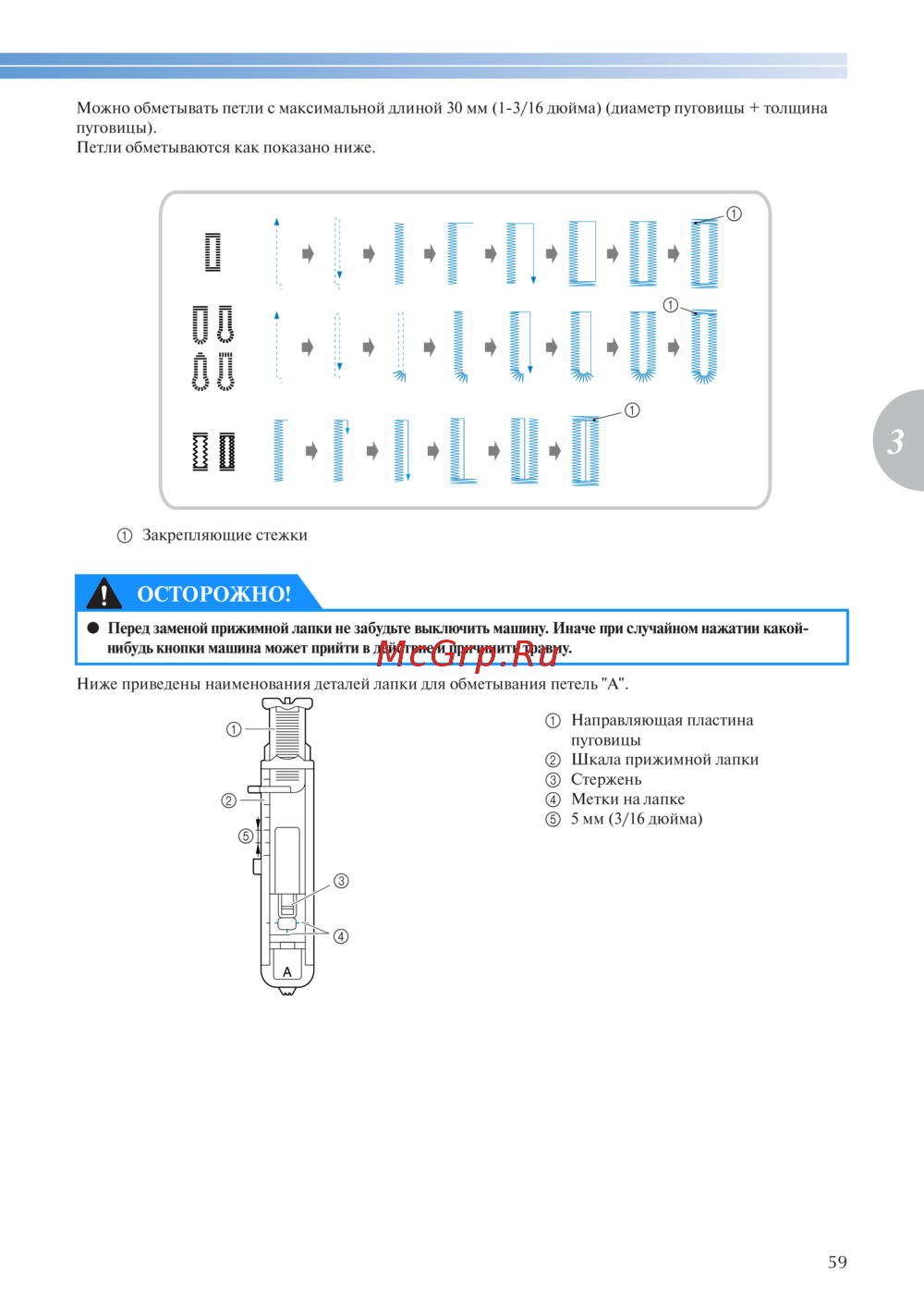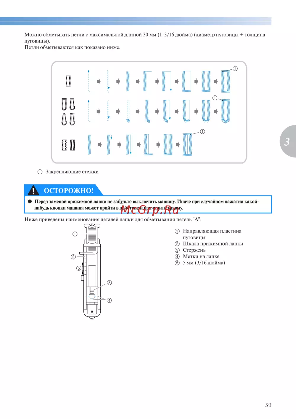 Можно обметывать петли с максимальной длиной 30 мм (13/16 дюйма) (диаметр пуговицы + толщина