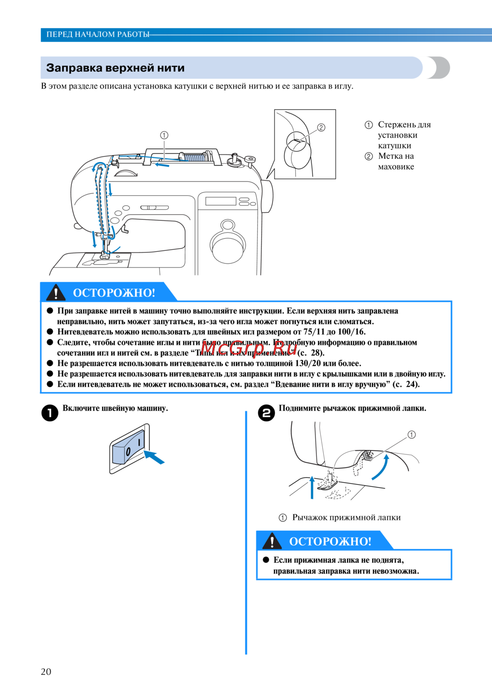 ● При заправке нитей в машину точно выполняйте инструкции. Если верхняя нить заправлена