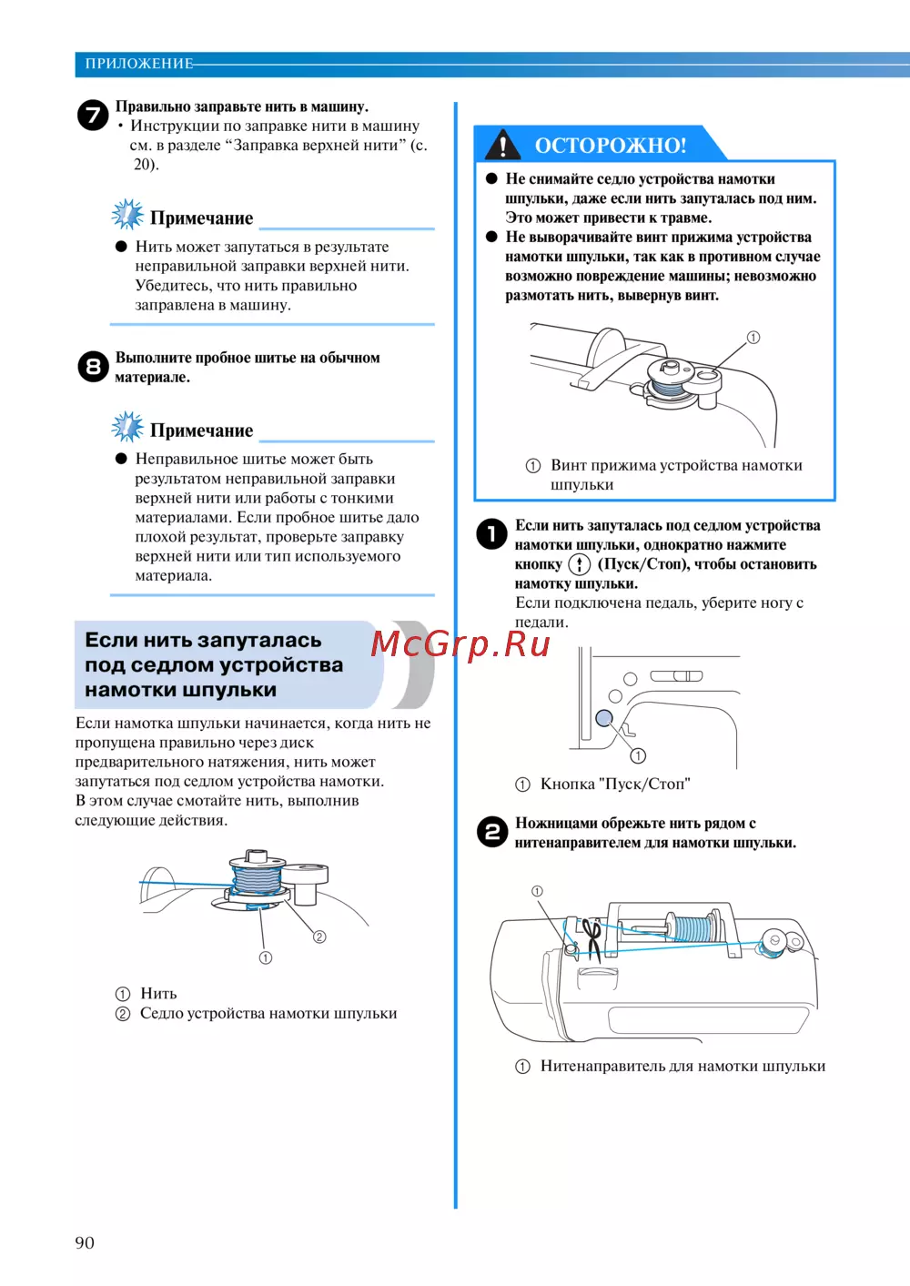 - Если нить запуталась под седлом устройства намотки шпульки p.92