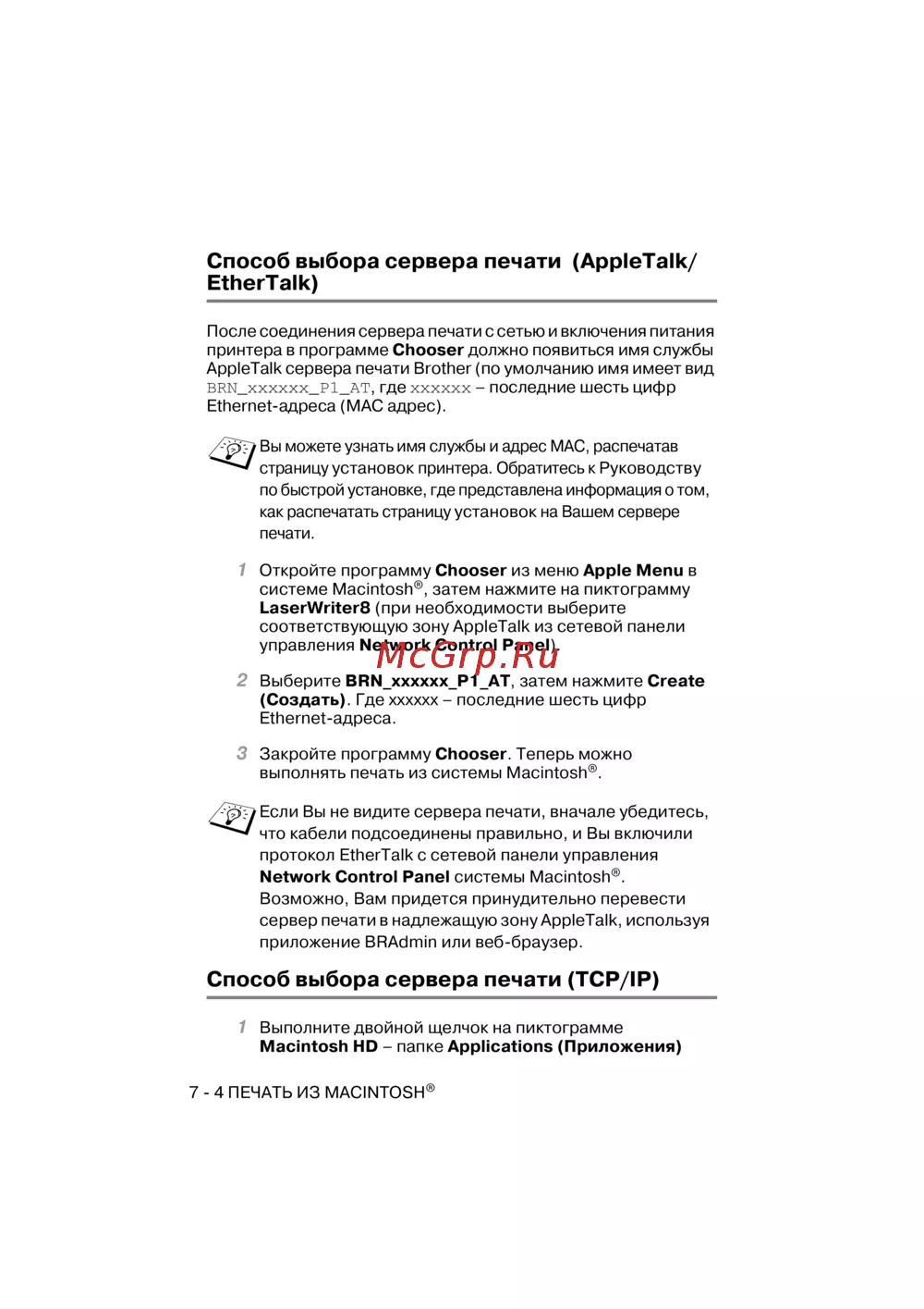 AppleTalk сервера печати Brother (по умолчанию имя имеет вид