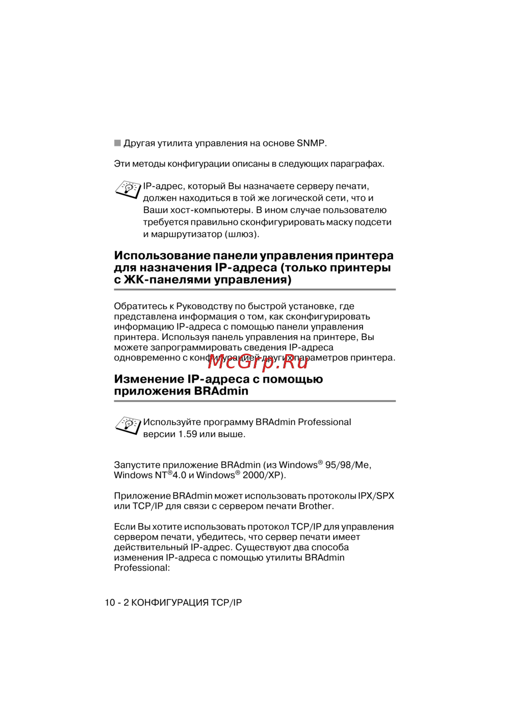 - Использование утилиты bradmin и протокола tcp ip для установки ipадреса p.127
