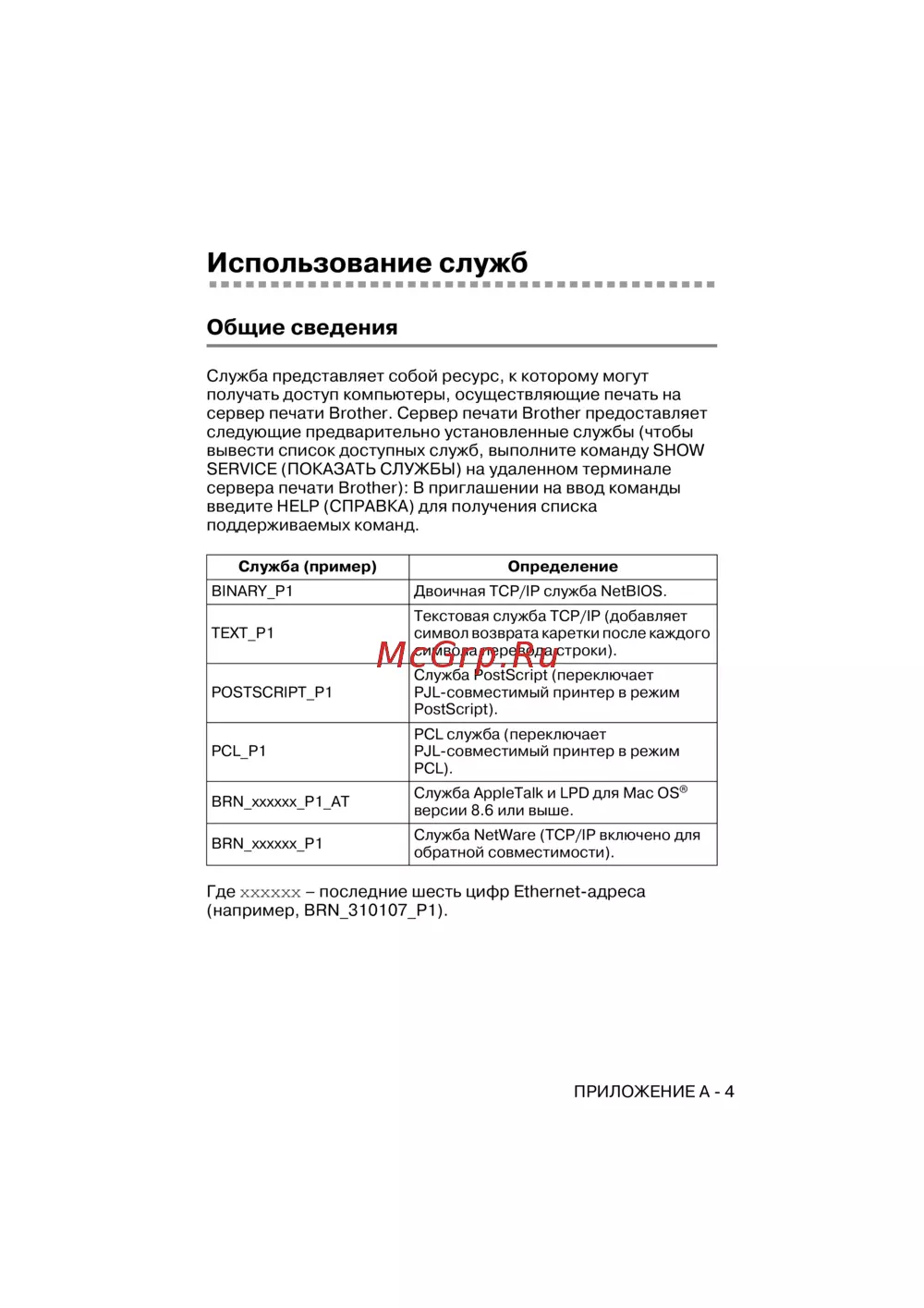 - Служба представляет собой ресурс к которому могут получать доступ компьютеры осуществляющие печать на сервер печати brother сервер печати brother предоставляет следующие предварительно установленные службы чтобы вывести список доступных служб выполните команду show service показать службы на удаленном терминале сервера печати brother в приглашении на ввод команды введите help справка для получения списка поддерживаемых команд p.154