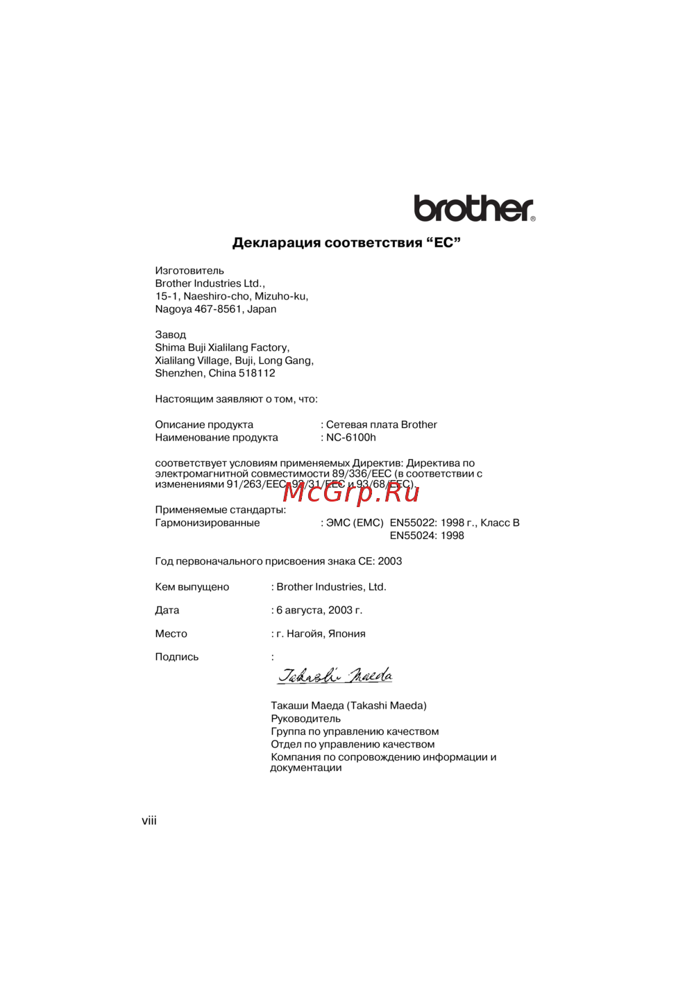 Brother HL-6050DN — декларация соответствия EC для сетевой платы [9]