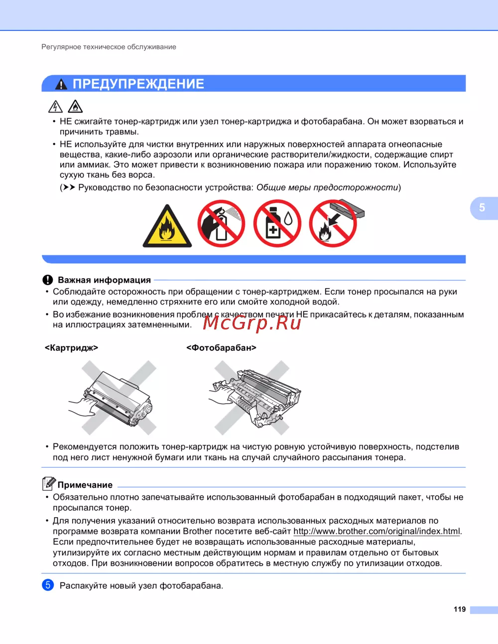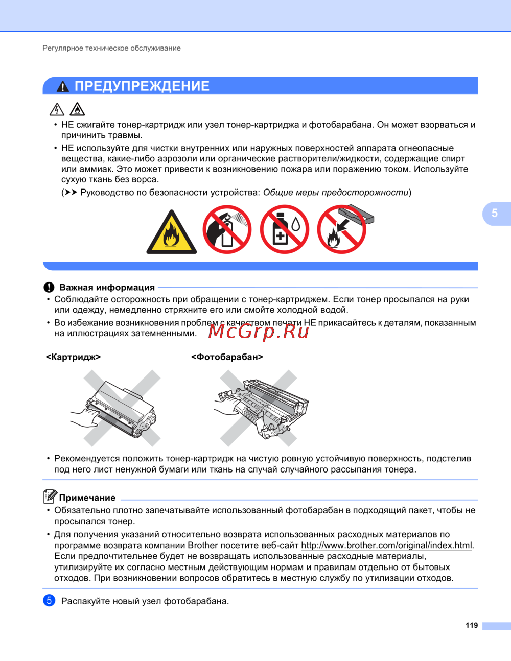 • НЕ сжигайте тонер-картридж или узел тонер-картриджа и фотобарабана. Он может взорваться и