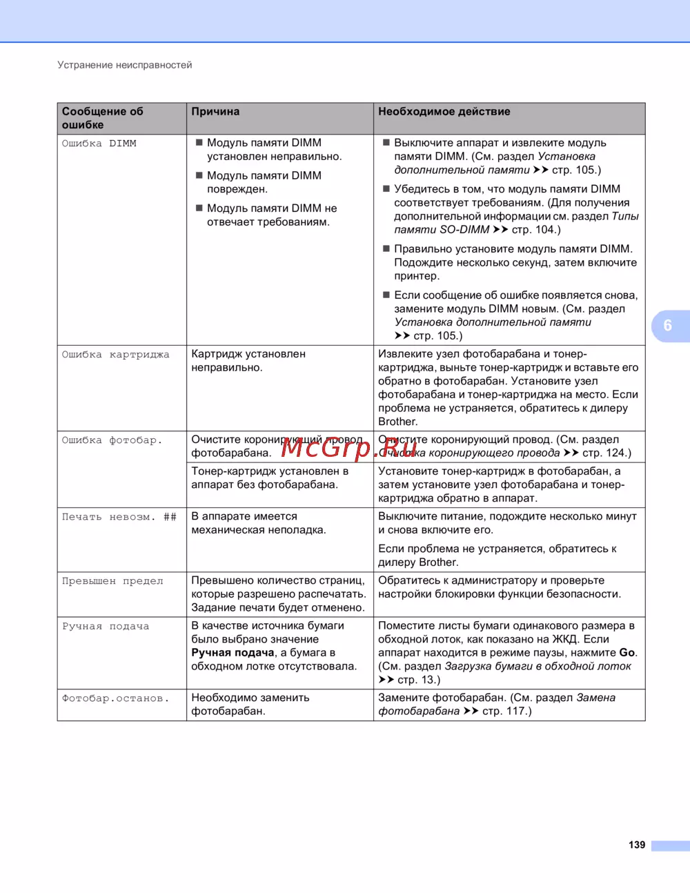 - Ошибка фотобарабана p.122