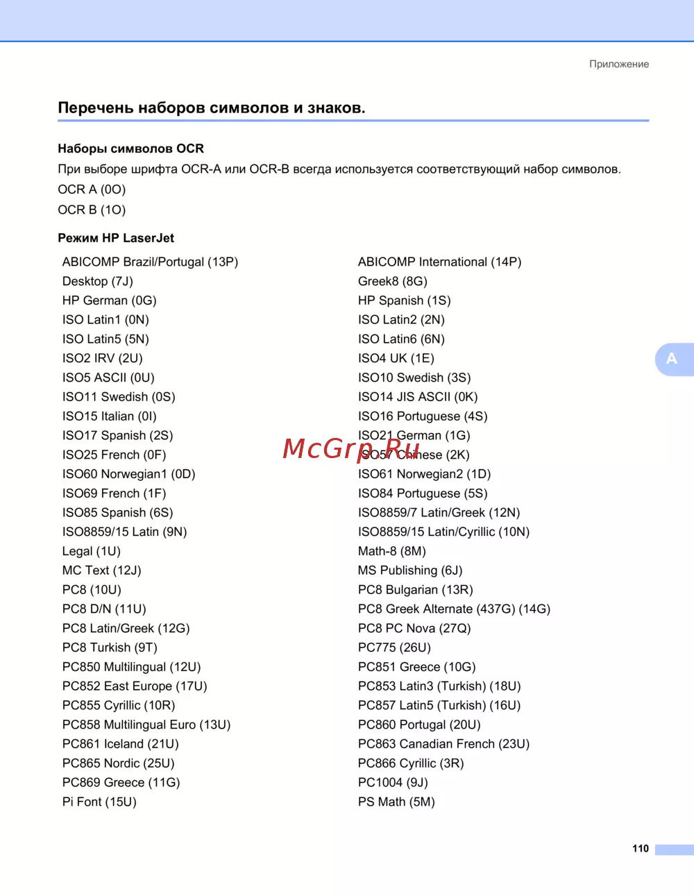 Brother HL-2170WR [117/0] Перечень наборов символов и знаков