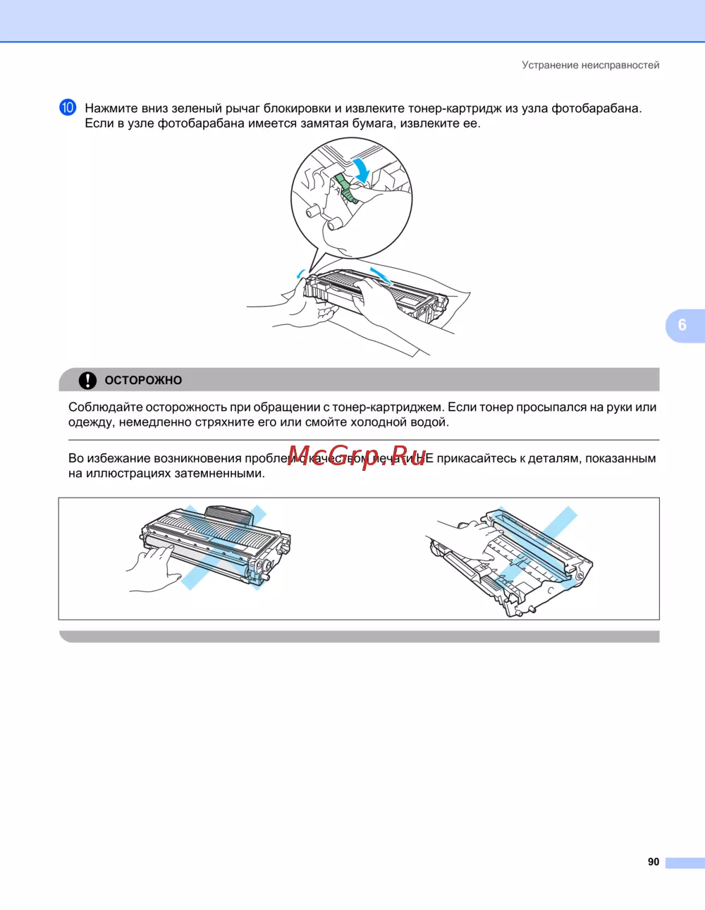 Соблюдайте осторожность при обращении с тонер-картриджем. Если тонер просыпался на руки или