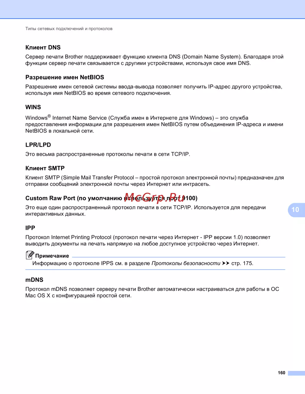Brother DCP-8250DN — типы сетевых подключений и протоколов для печати и обмена данными [167]
