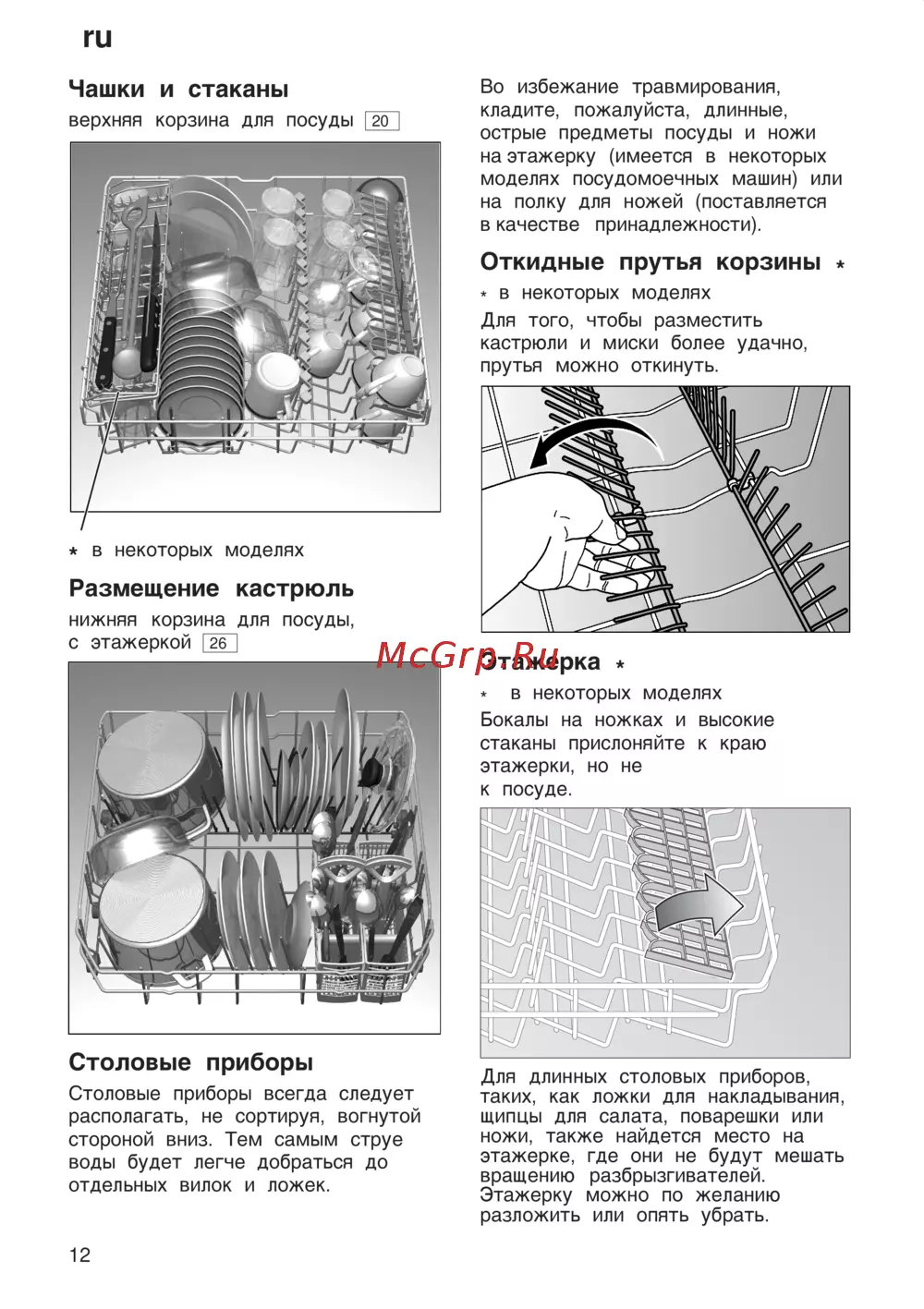ги Чашки и стаканы верхняя корзина для посуды 120 Во избежание травмирования кладите пожалуйста длинные острые предметы посуды и ножи на этажерку имеется в некоторых моделях посудомоечных машин или на полку для ножей поставляется в качестве принадлежности Откидные прутья корзины в некоторых моделях Для того чтобы разместить кастрюли и миски более удачно прутья можно откинуть в некоторых моделях Размещение кастрюль нижняя корзина для посуды с этажеркой 126 Этажерка в некоторых моделях Бокалы на ножках и высокие стаканы прислоняйте к краю этажерки но не к посуде Столовые приборы Столовые приборы всегда следует располагать не сортируя вогнутой стороной вниз Тем самым струе воды будет легче добраться до отдельных вилок и ложек 12 Для длинных столовых приборов таких как ложки для накладывания щипцы для салата поварешки или ножи также найдется место на этажерке где они не будут мешать вращению разбрызгивателей Этажерку можно по желанию разложить или опять убрать