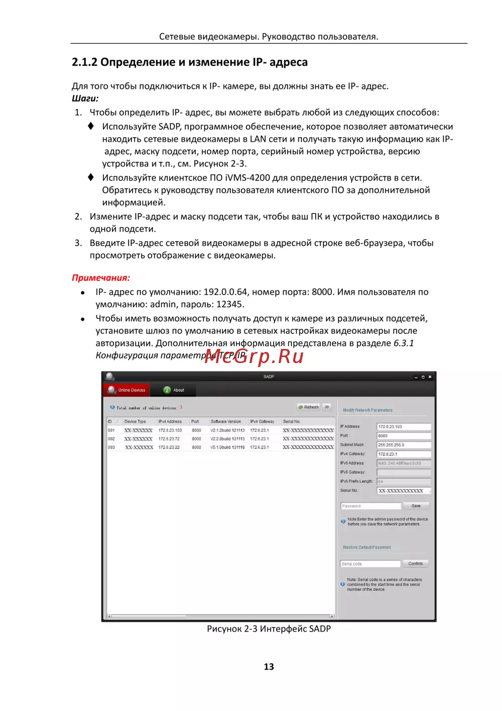 IP- адрес по умолчанию: 192.0.0.64, номер порта: 8000. Имя пользователя по
