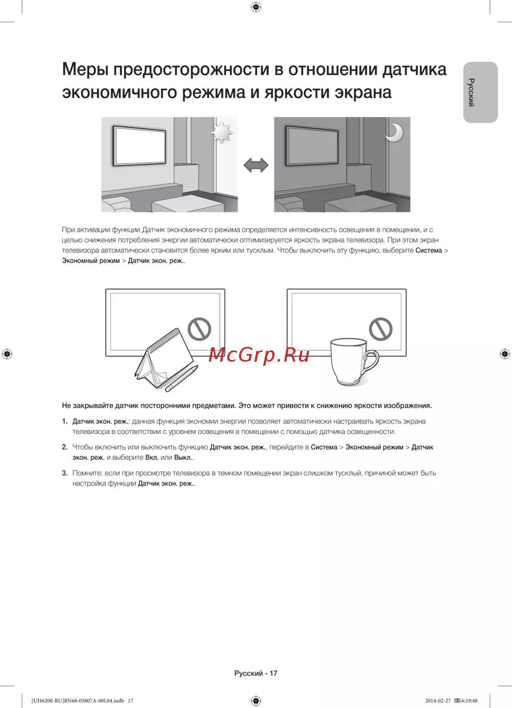 ![Samsung UE32H6200AK [17/83] Меры предосторожности в отношении датчика экономичного режима и яркости экрана](/views2/1116538/page17/bg11.png)