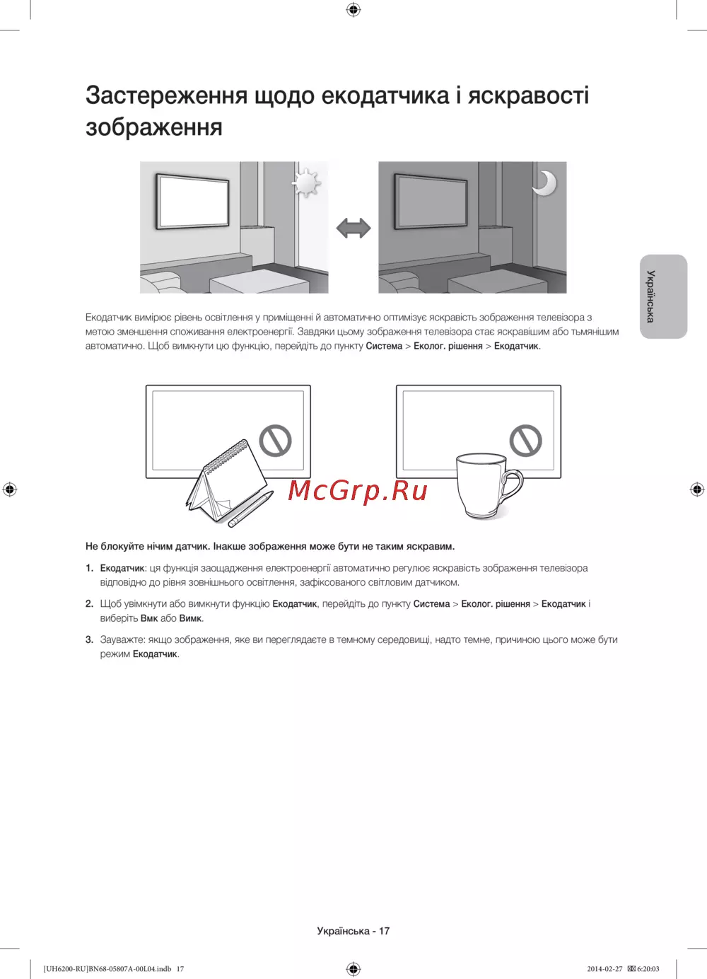 Samsung UE32H6200AK [59/83] Застереження щодо екодатчика і яскравості зображення