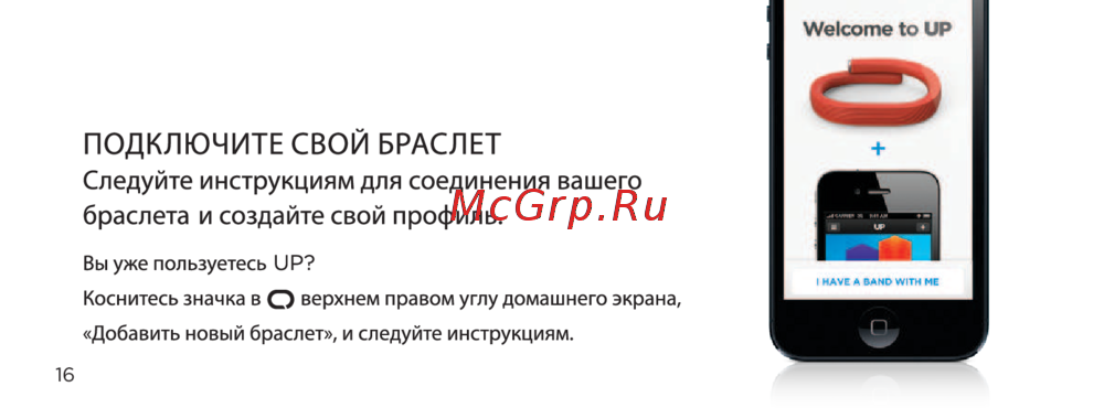 Welco ne Ю ЦР ПОДКЛЮЧИТЕ СВОЙ БРАСЛЕТ Следуйте инструкциям для соединения вашего браслета и создайте свой профиль Вы уже пользуетесь ОР Коснитесь значка в О верхнем правом углу домашнего экрана Добавить новый браслет и следуйте инструкциям