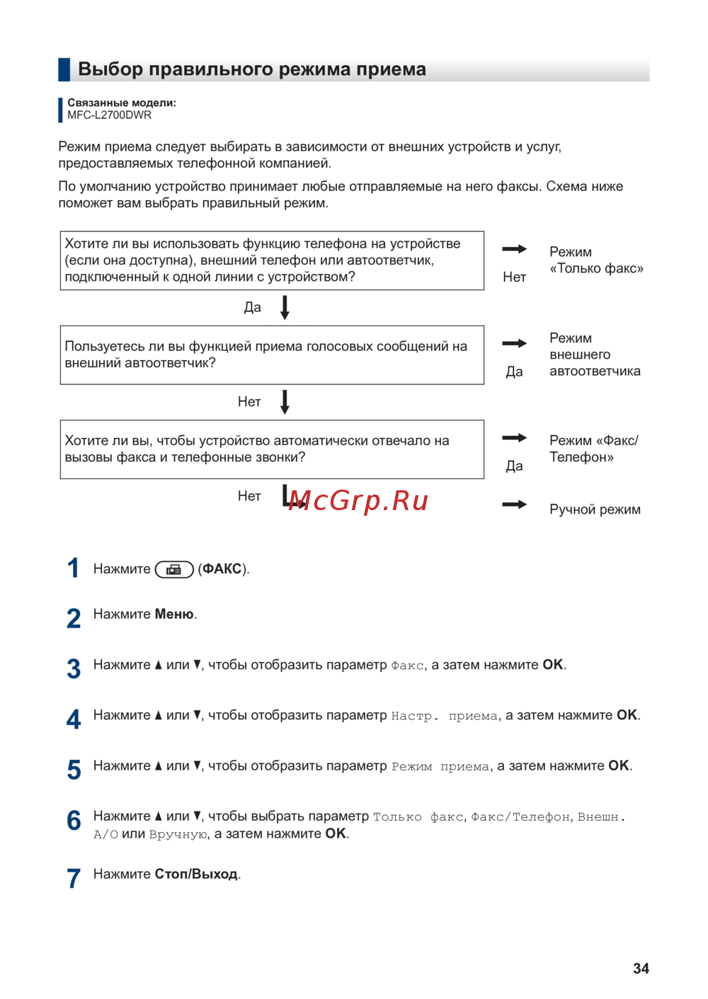 Brother MFC-L2700DWR — как выбрать режим приема факсов и телефонных звонков [46/82]