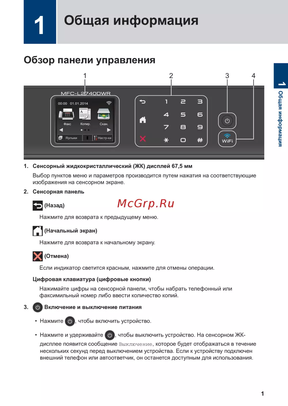 Изучите основные функции панели управления, включая сенсорный экран, цифровую клавиатуру и управление питанием. Узнайте, как легко использовать устройство.