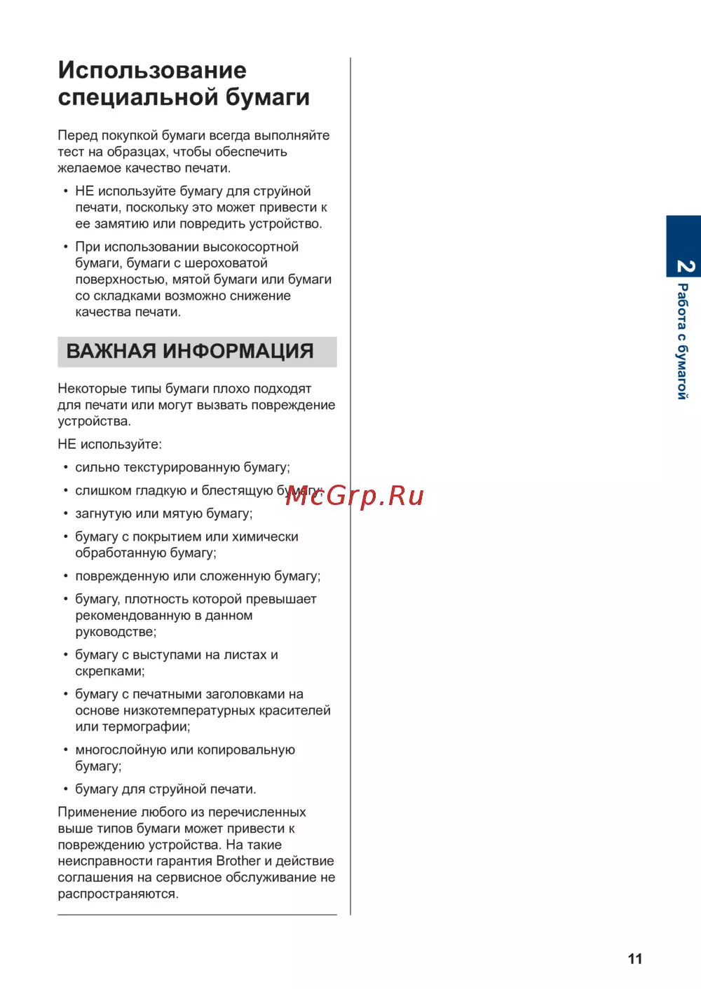 выше типов бумаги может привести к