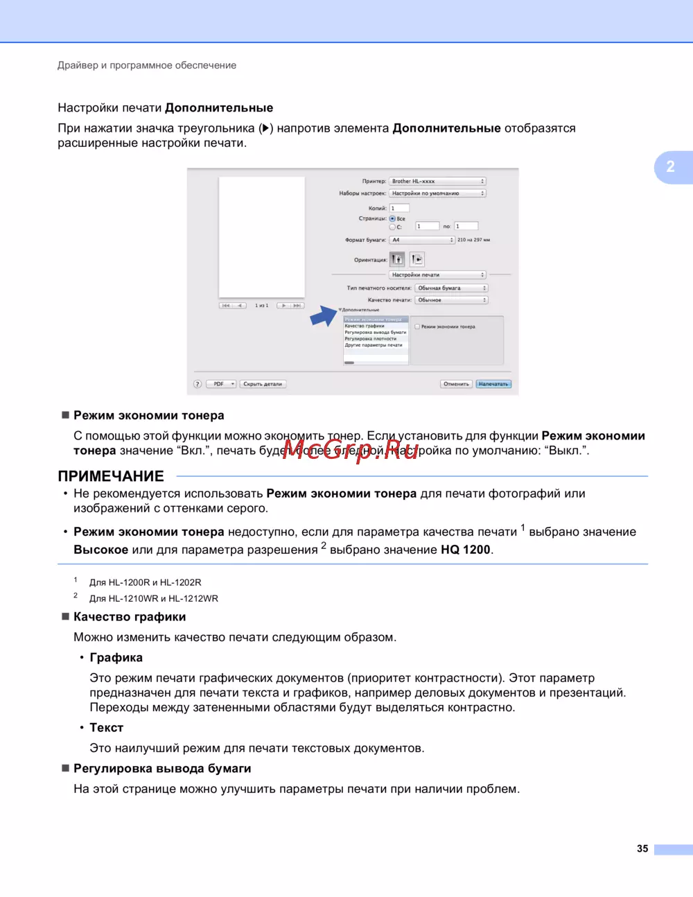 • Режим экономии тонера недоступно, если для параметра качества печати