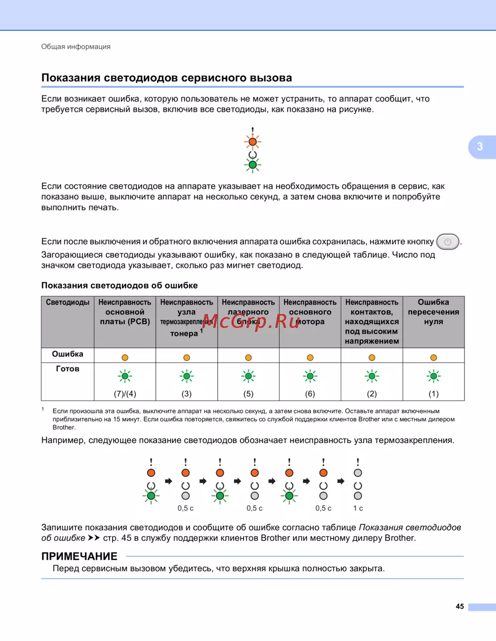 - Запишите показания светодиодов и сообщите об ошибке согласно таблице показания светодиодов об ошибке uu стр 45 в службу поддержки клиентов brother или местному дилеру brother p.53