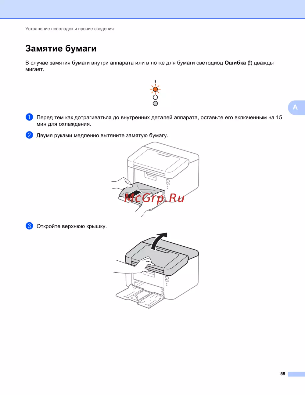 В случае замятия бумаги внутри аппарата или в лотке для бумаги светодиод Ошибка () дважды