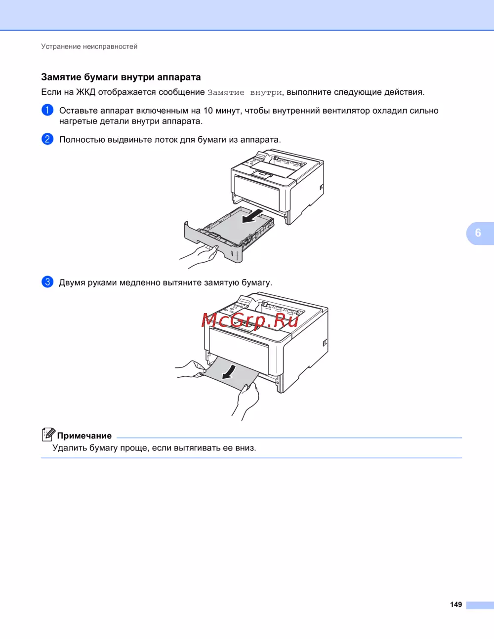 Удалить бумагу проще, если вытягивать ее вниз.
