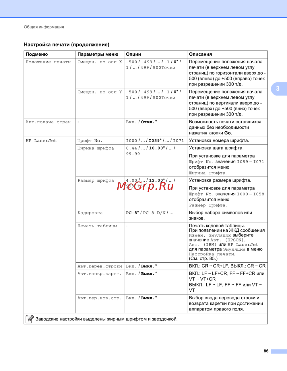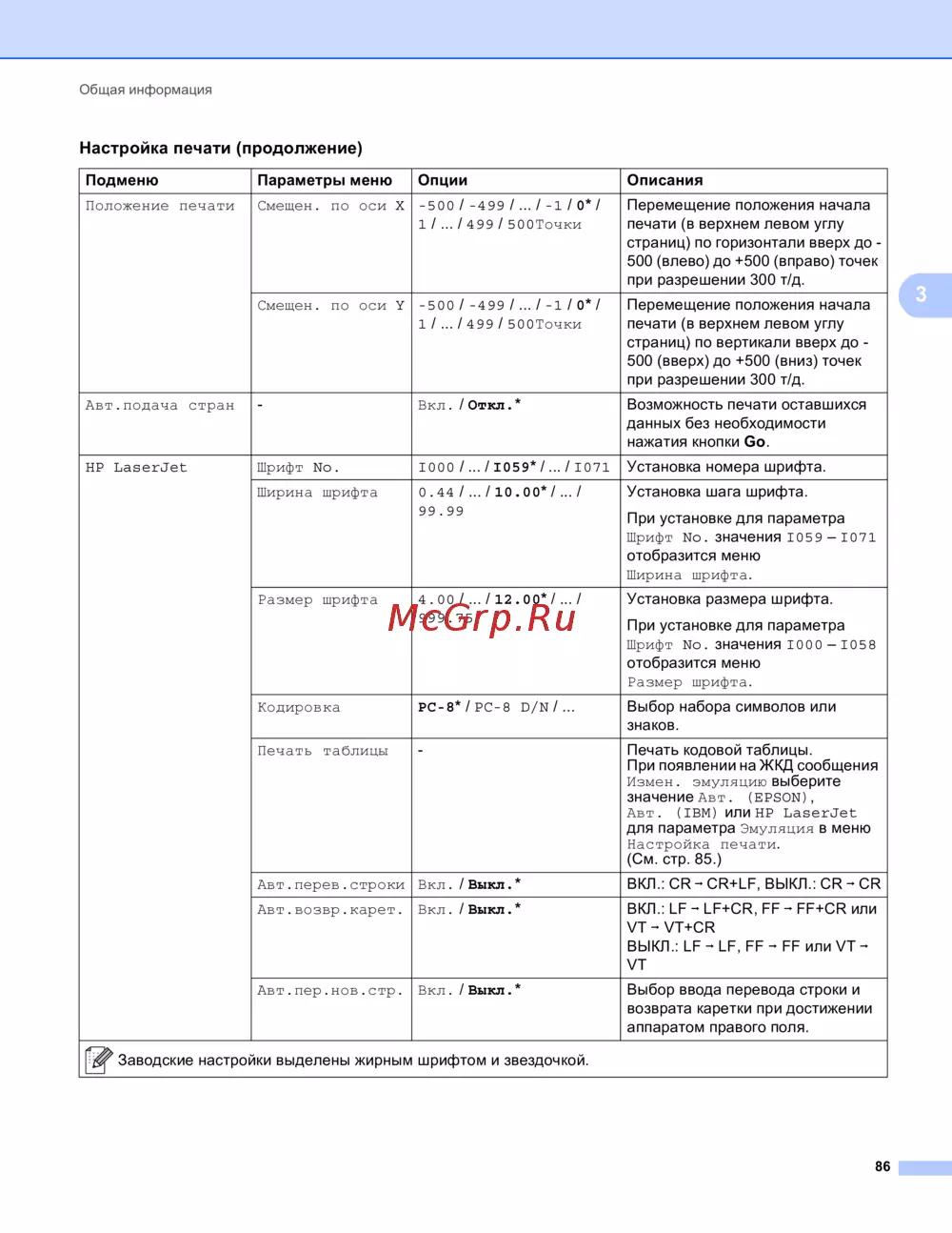 Заводские настройки выделены жирным шрифтом и звездочкой.