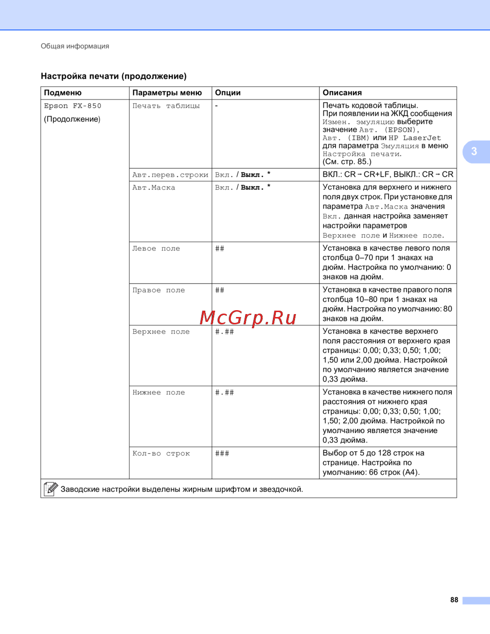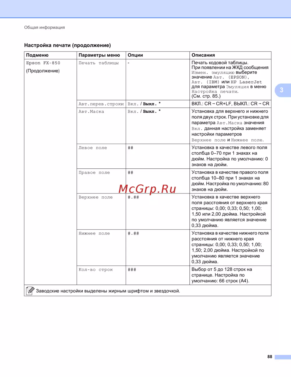 Заводские настройки выделены жирным шрифтом и звездочкой.