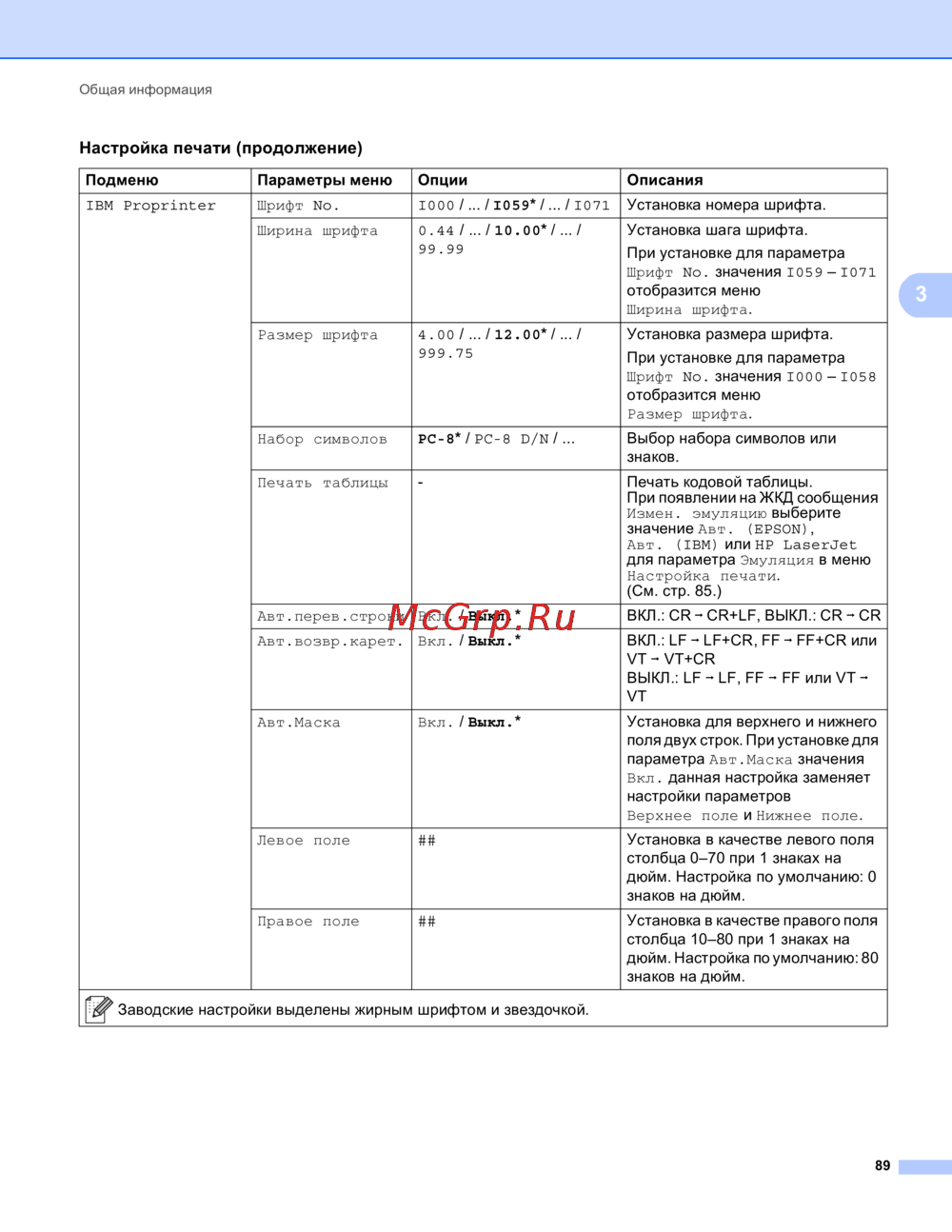 Заводские настройки выделены жирным шрифтом и звездочкой.