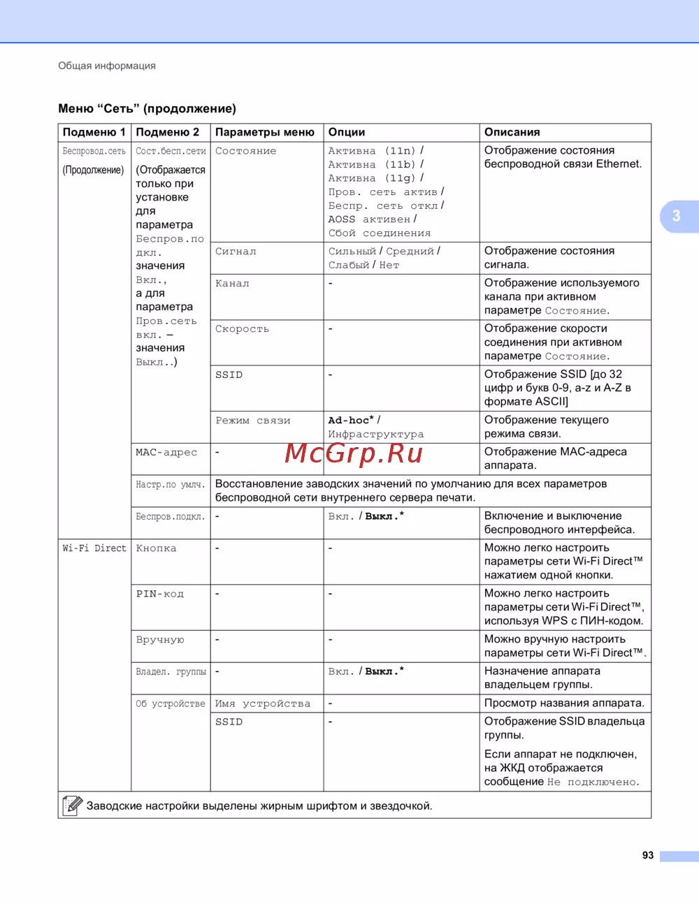 Заводские настройки выделены жирным шрифтом и звездочкой.