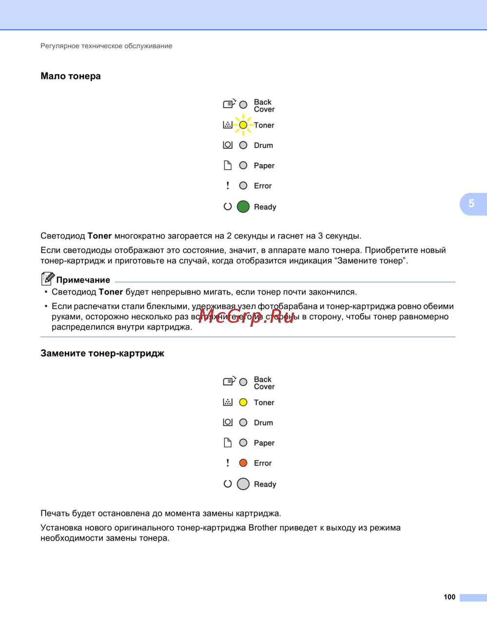 • Светодиод Toner будет непрерывно мигать, если тонер почти закончился.