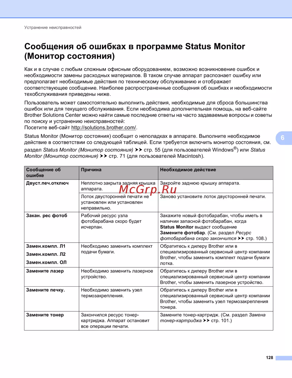 - Пользователь может самостоятельно выполнить действия необходимые для сброса большинства ошибок или для текущего обслуживания если необходима дополнительная помощь на веб сайте brother solutions center можно найти самые последние ответы на часто задаваемые вопросы и советы по поиску и устранению неисправностей посетите веб сайт http solutions brother com p.134