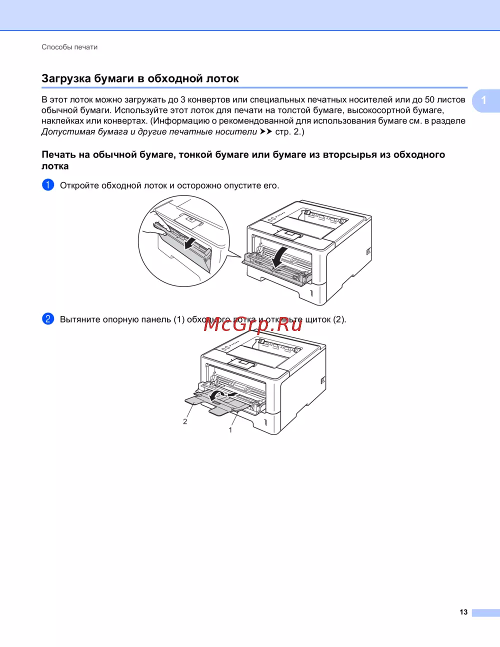 Загрузка бумаги в обходной лоток 1