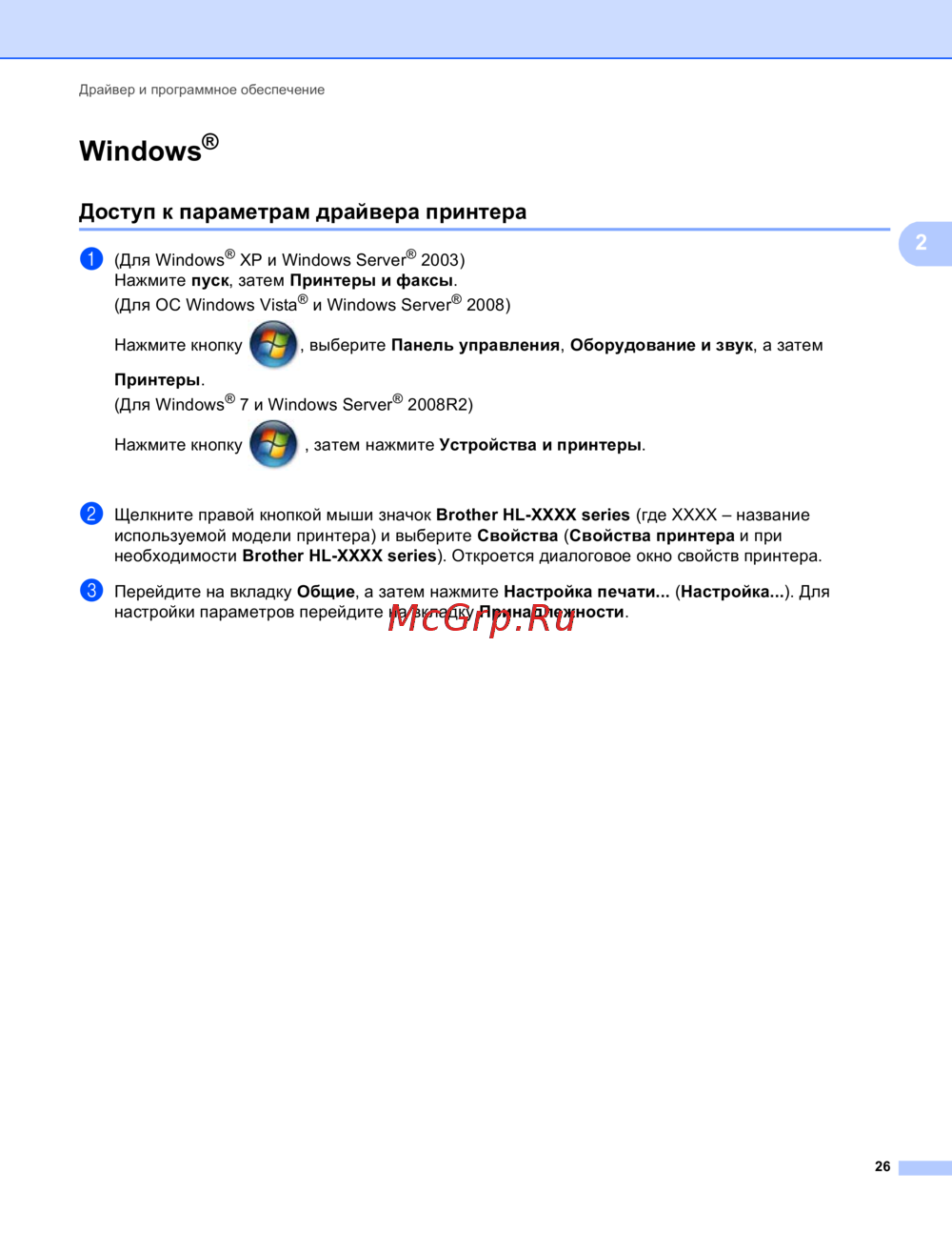 Доступ к параметрам драйвера принтера 2