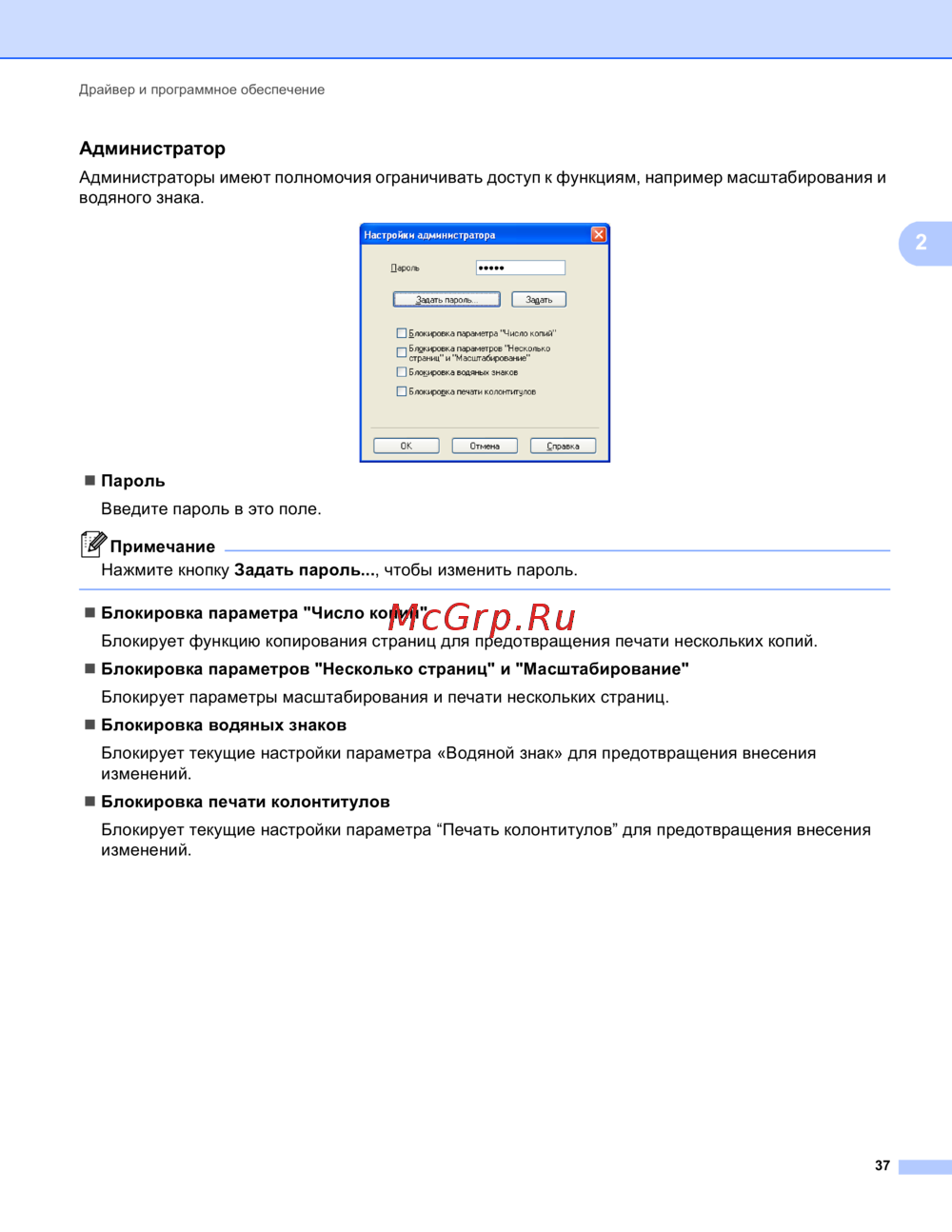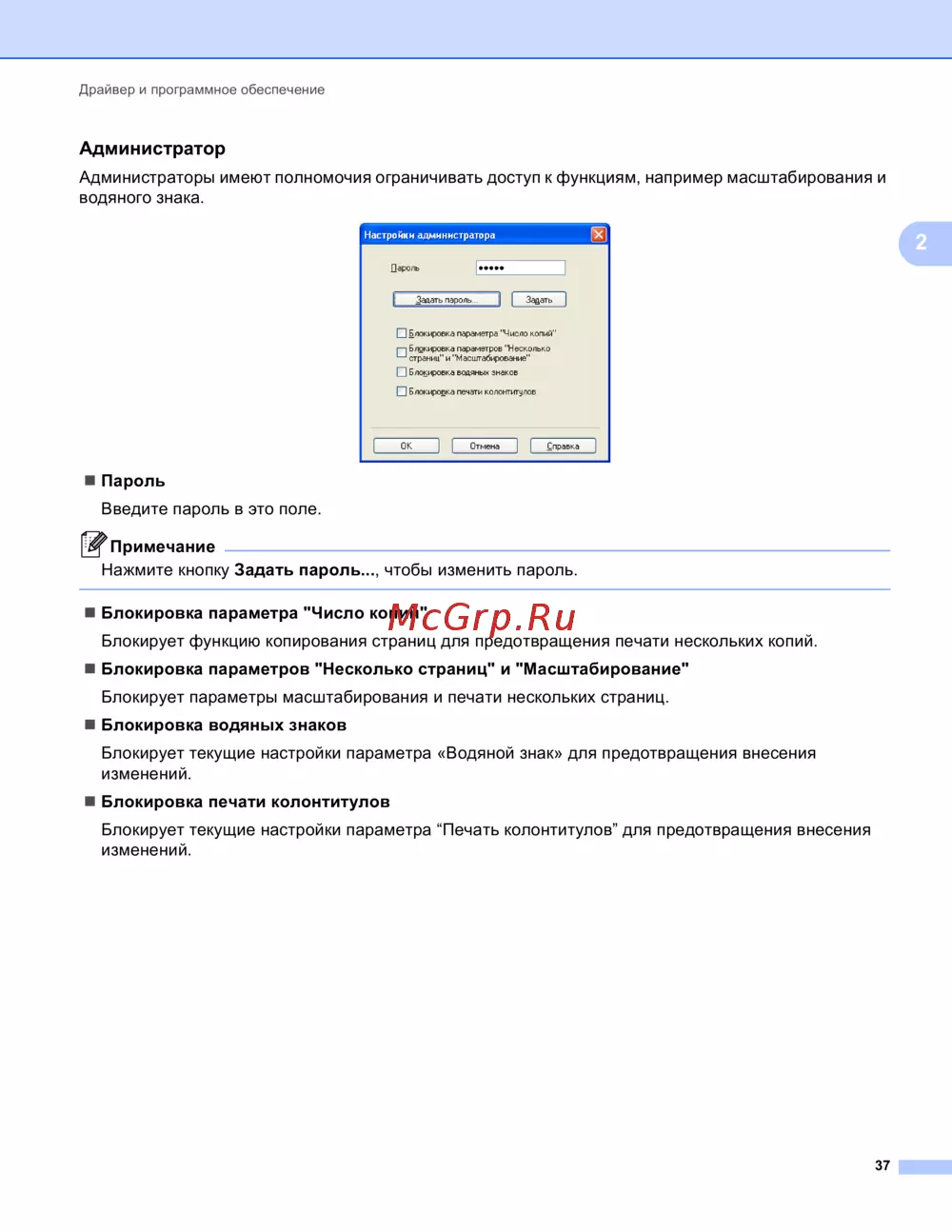 Узнайте, как администраторы могут ограничивать доступ к функциям печати, включая масштабирование, водяные знаки и колонтитулы. Защитите свои настройки.