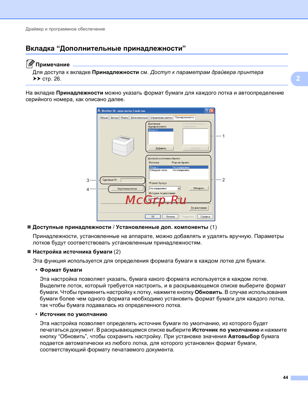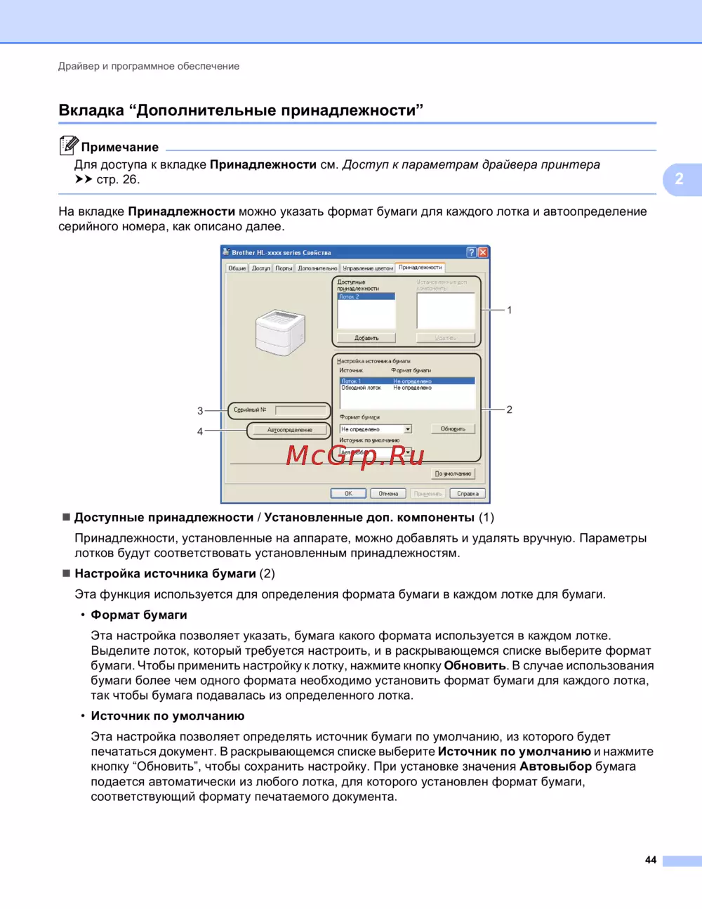 На вкладке Принадлежности можно указать формат бумаги для каждого лотка и автоопределение