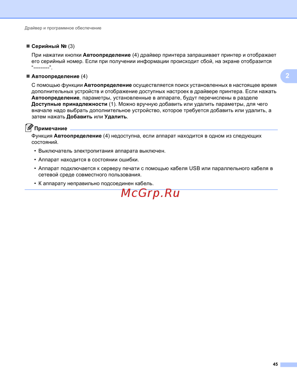 При нажатии кнопки Автоопределение (4) драйвер принтера запрашивает принтер и отображает