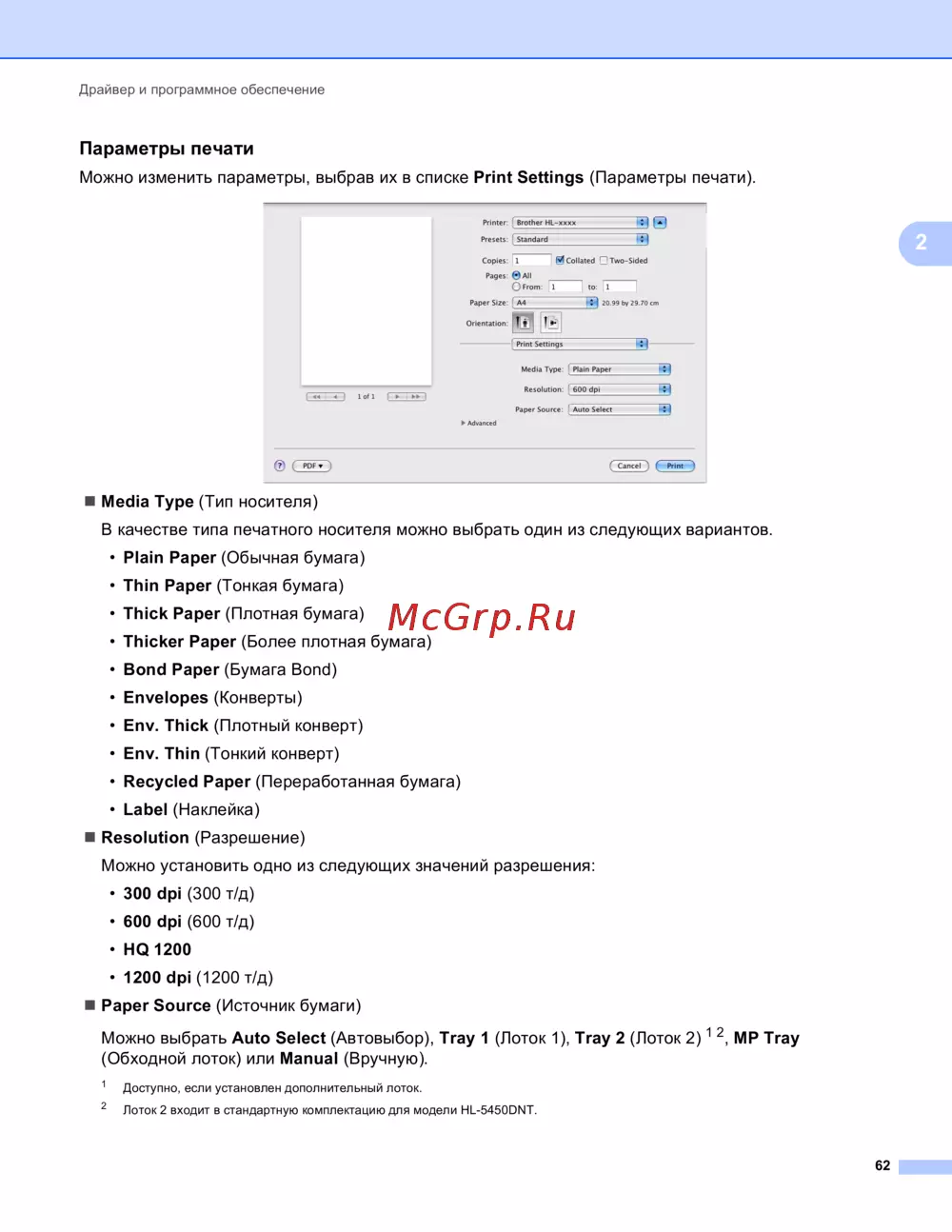 Можно выбрать Auto Select (Автовыбор), Tray 1 (Лоток 1), Tray 2 (Лоток 2)