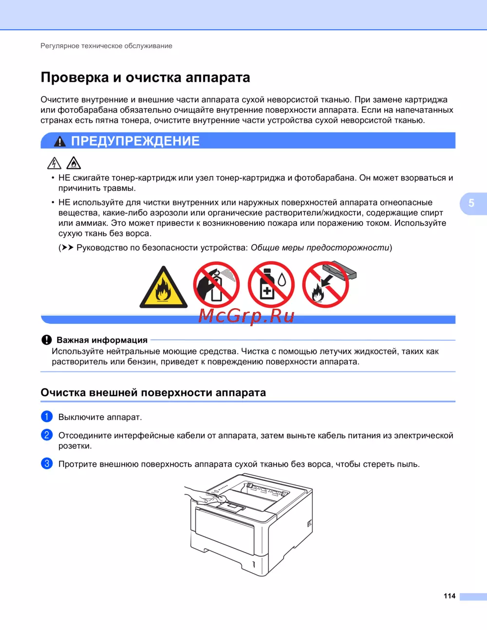 • НЕ используйте для чистки внутренних или наружных поверхностей аппарата огнеопасные