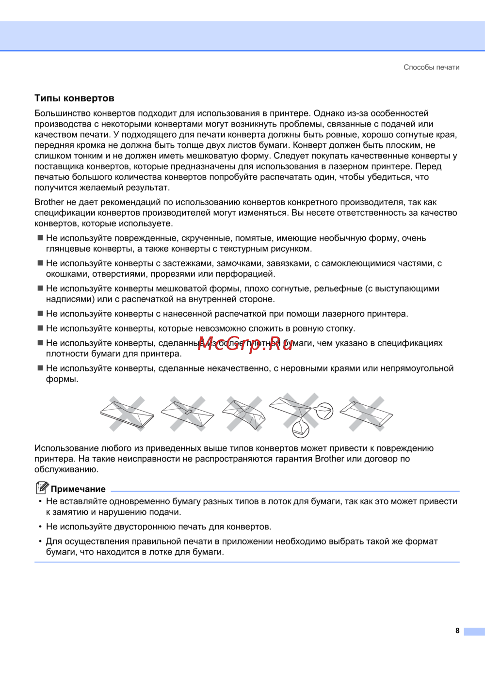 Не используйте конверты с нанесенной распечаткой при помощи лазерного принтера.