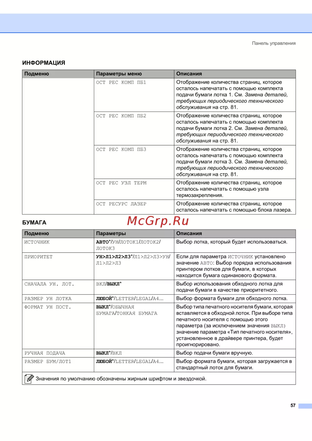 Значения по умолчанию обозначены жирным шрифтом и звездочкой.