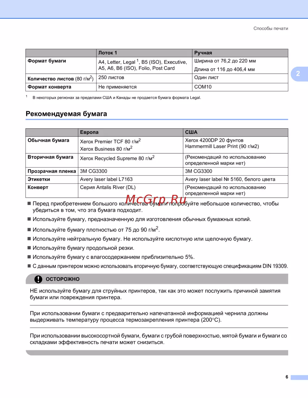 НЕ используйте бумагу для струйных принтеров, так как это может послужить причиной замятия