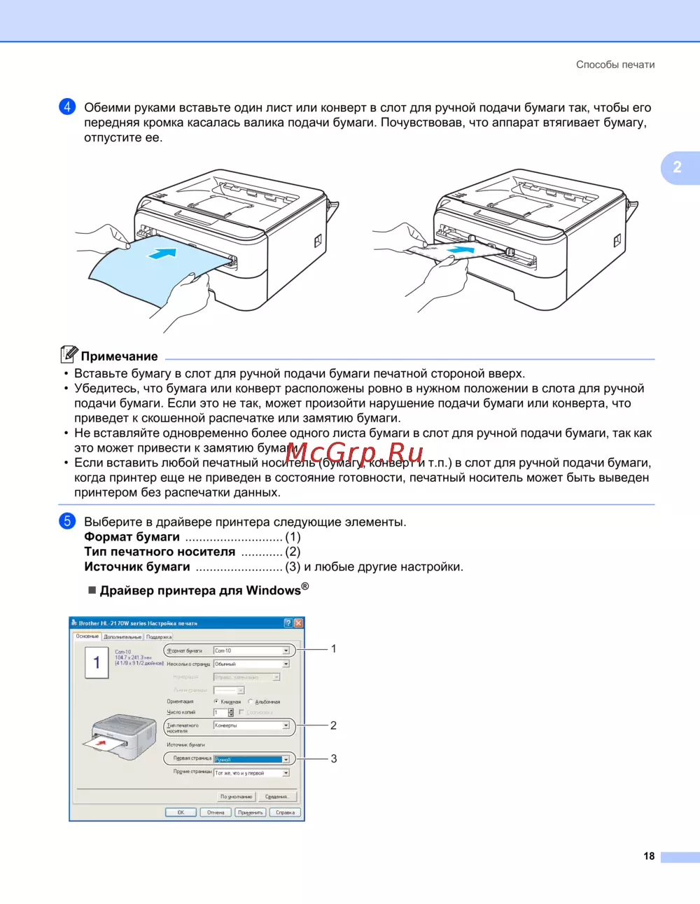 Узнайте, как правильно вставлять бумагу и конверты в слоты для ручной подачи в принтере, чтобы избежать замятий и скошенной распечатки.