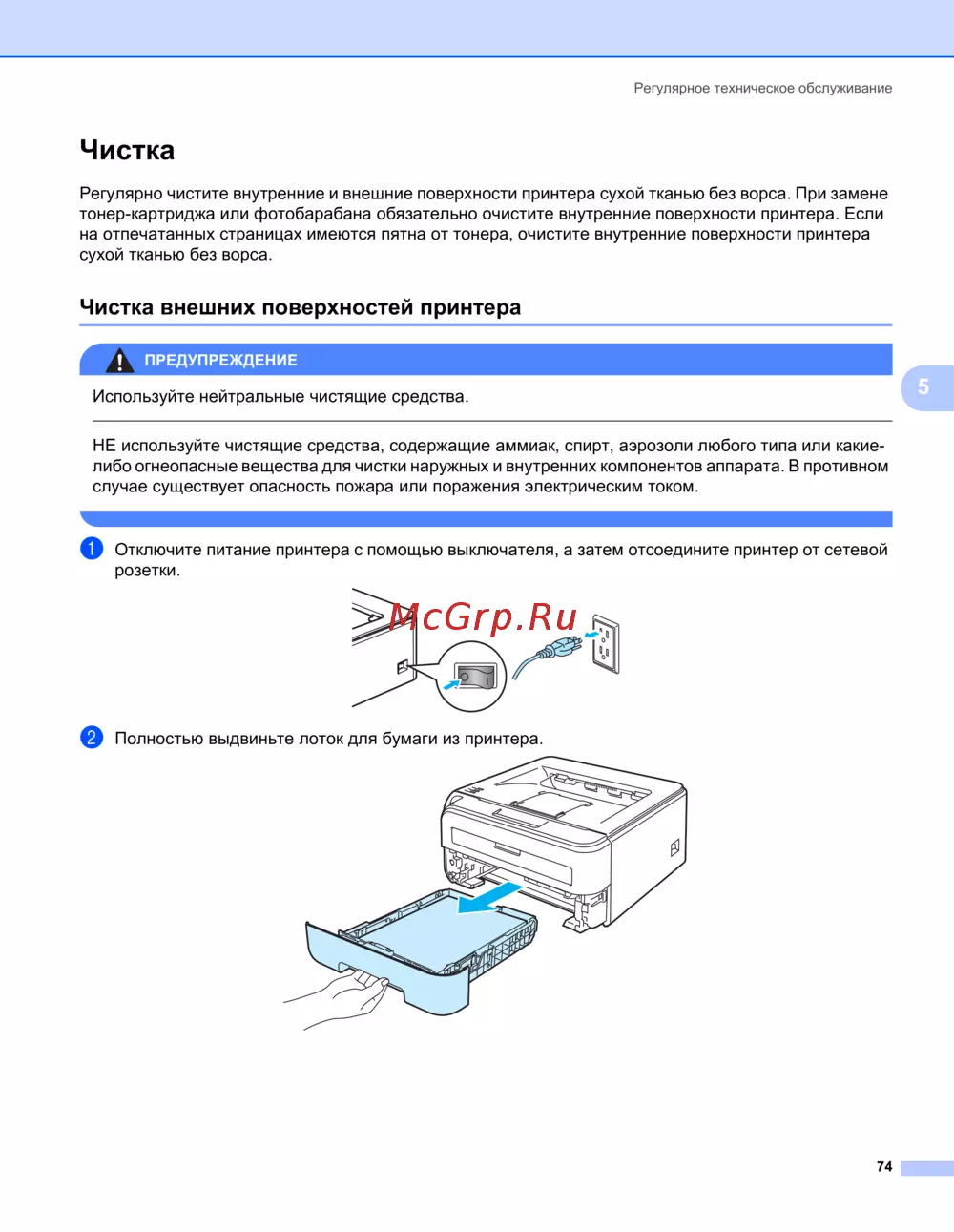 Регулярно чистите внутренние и внешние поверхности принтера сухой тканью без ворса. При замене
