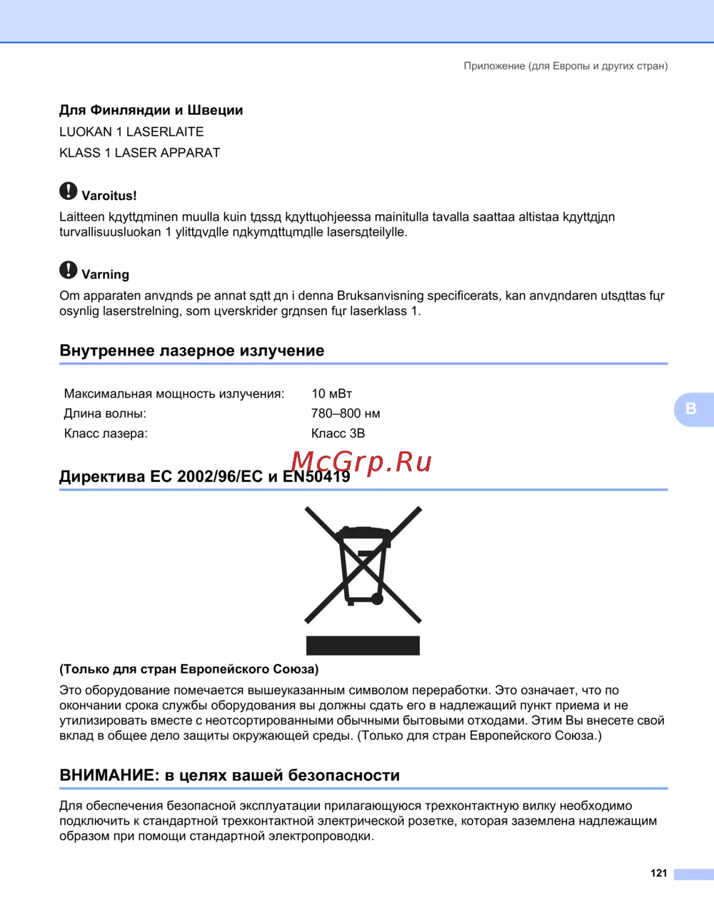 - Спецификация iec 60825 1 только модели с напряжением питания от 220 до 240 в p.127