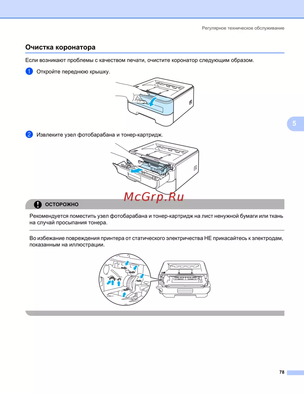 Если возникают проблемы с качеством печати, очистите коронатор следующим образом.