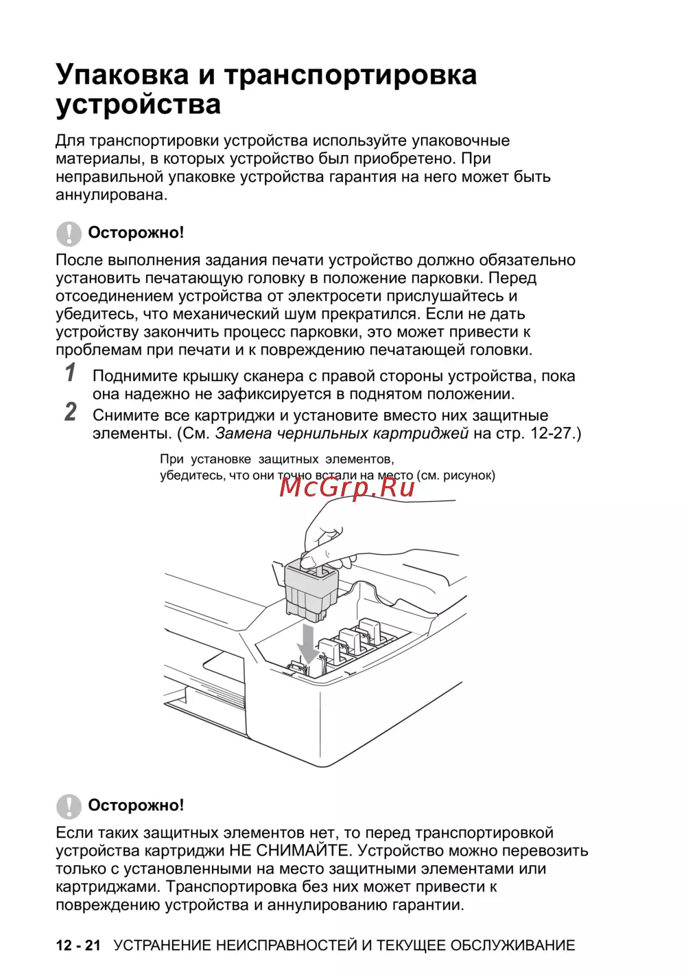 картриджами. Транспортировка без них может привести к