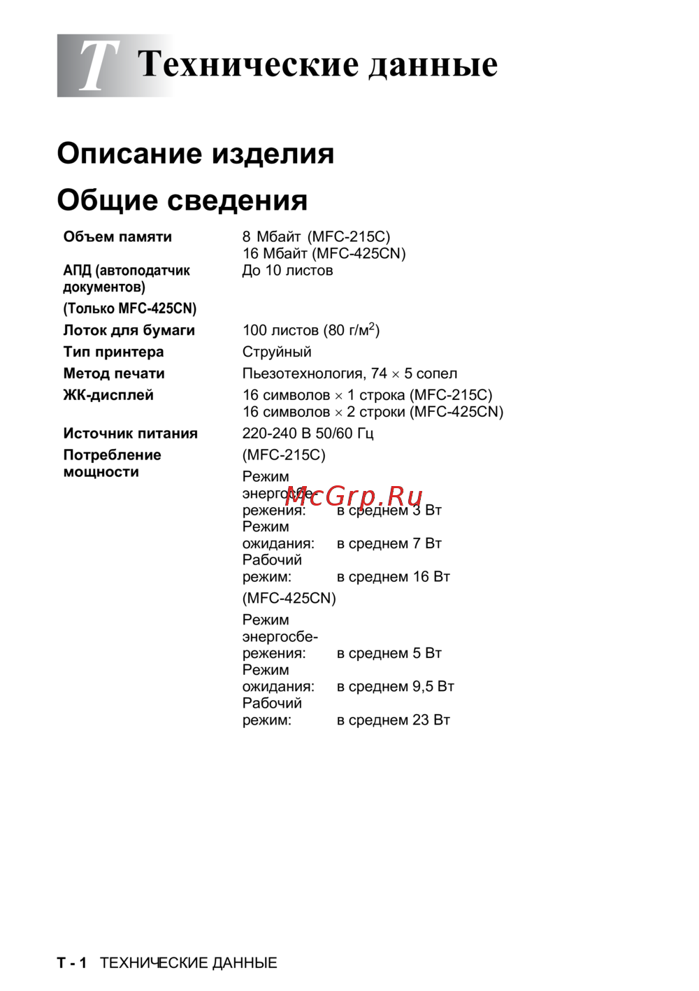 ![Brother MFC-425CN [182/202] Технические данные](/views2/1118275/page182/bgb6.png)