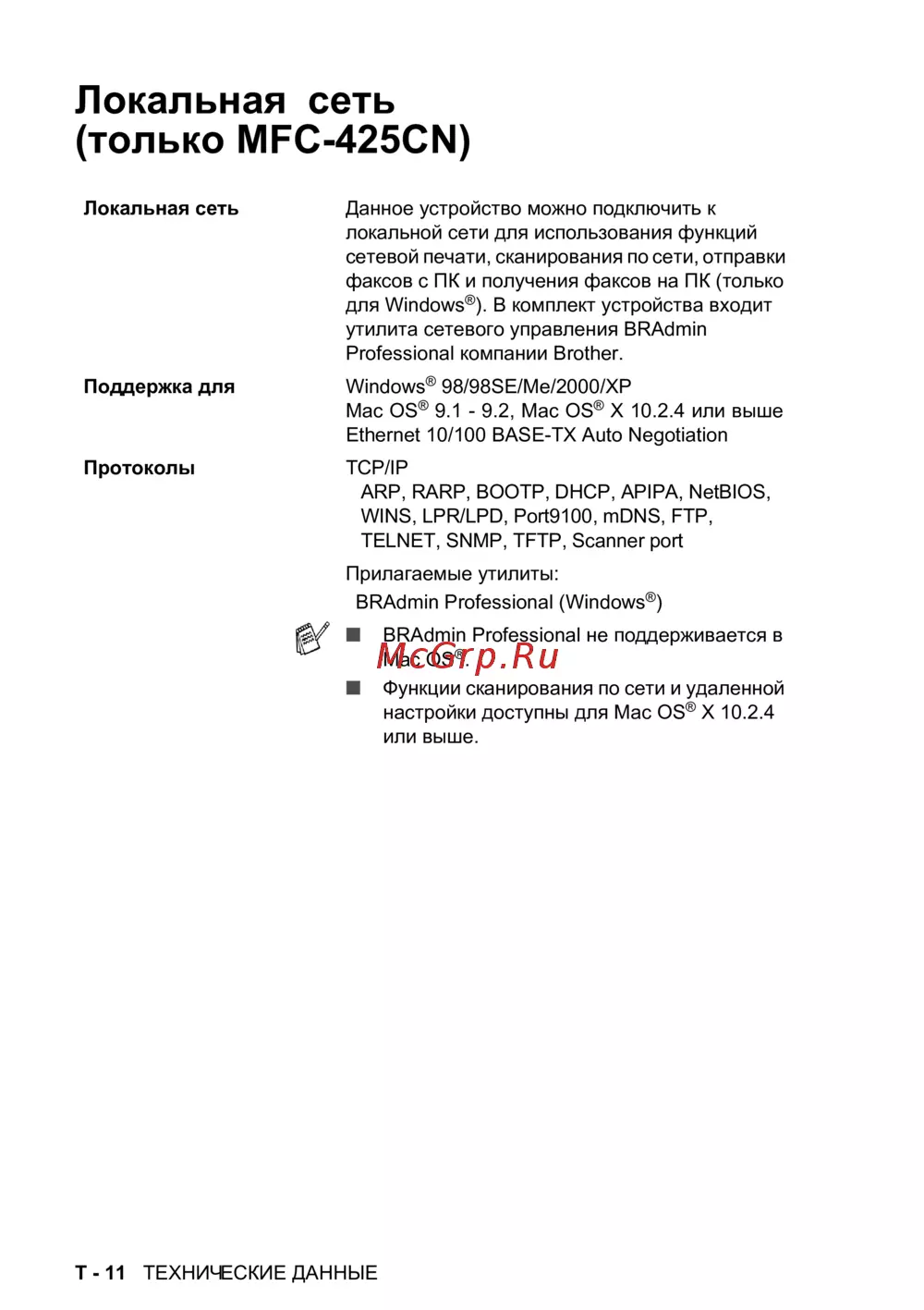 Brother MFC-425CN — технические данные для локальной сети и сетевых функций [192/202]