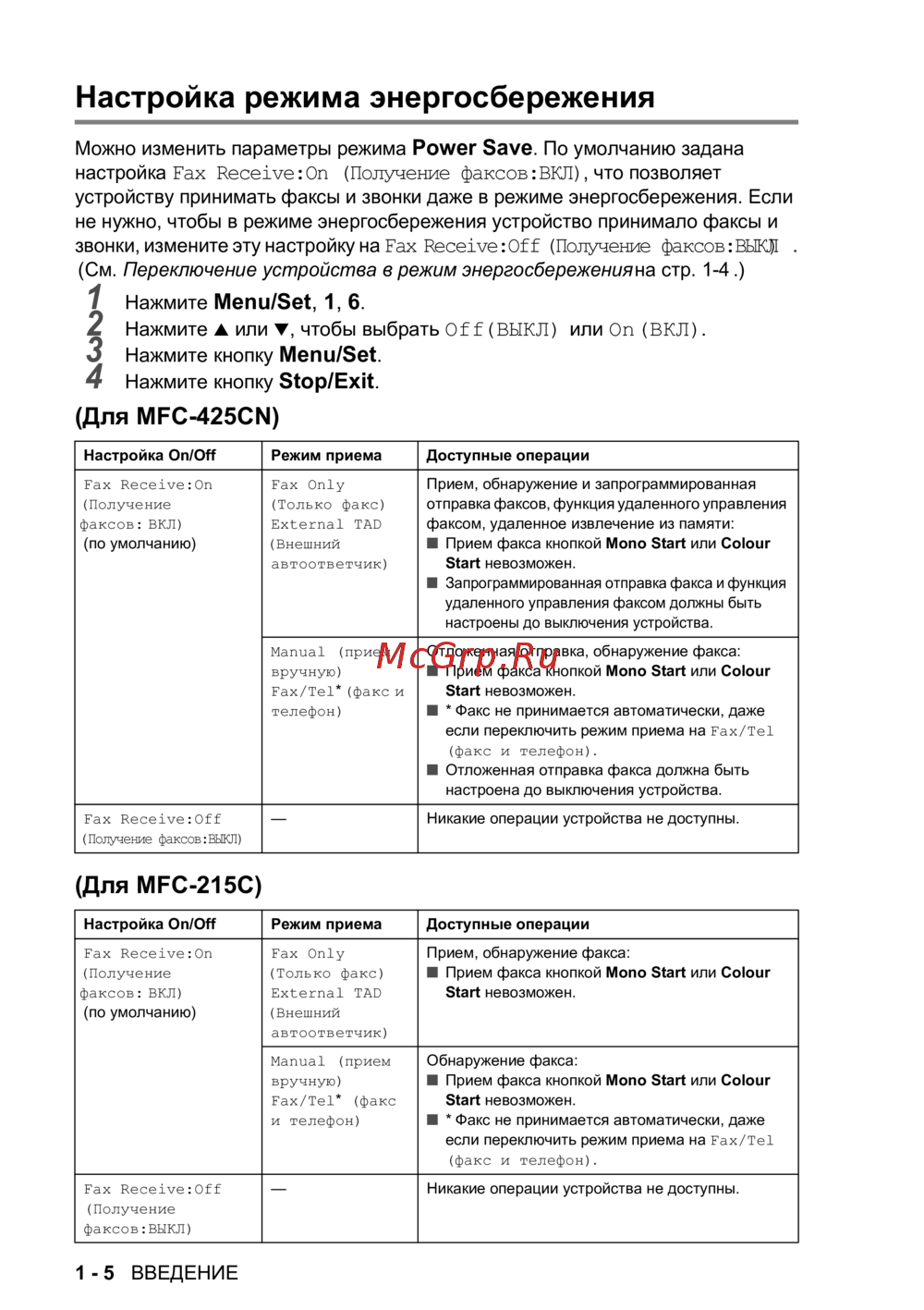 Brother MFC-425CN — настройка режима энергосбережения и приема факсов [24/202]
